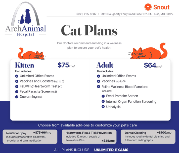 - Wellness Plans cover the expected stuff – like vaccines, exams, bloodwork, and preventive care – all bundled into a budget-friendly monthly plan.